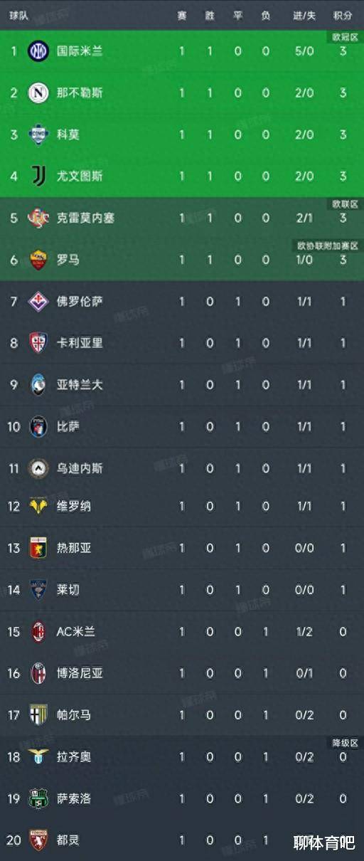 意甲第一轮结束了所有比赛,最新积分榜如下!