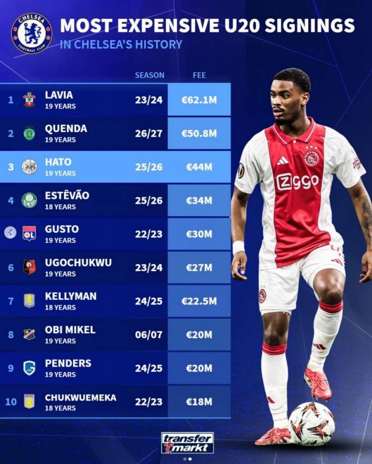 德转列切尔西队史U20球员引援花费榜:拉维亚居首,哈托第三